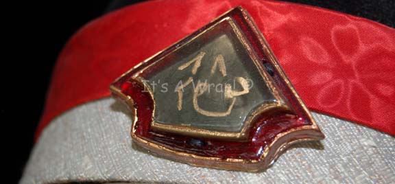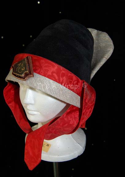 Description: A costume element of the style featured in “Search for Spock” and “The Voyage Home” as well as variously in Star Trek episodic television. A black felt hat in the Vulcan-style, featuring tan trim and accent, more red trim in a floral pattern that covers the neck in the back and an adjustable chin strap, and faux jewel in a stylized ‘arrow’ shape with Vulcan iconographic symbols on it. A sewn in Paramount tag reads ‘2-14 M’.