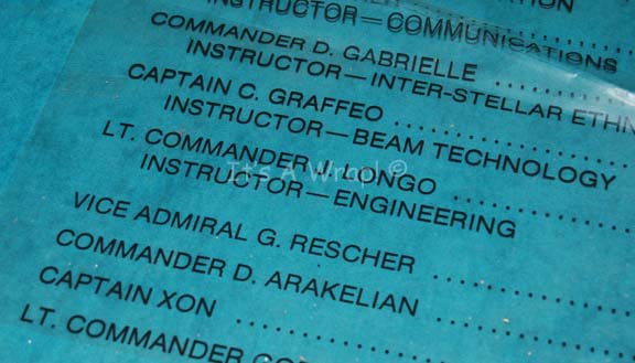 Description: A pair of differently sized sheets of clear cellophane with black lettering and numbering like the one featured in Star Trek II: The Wrath of Khan. The items are directories to offices in Starfleet Command similar to the one appearing briefly to the right of “Spock” (Leonard Nimoy) during the scene in which he gives “Admiral Kirk” (William Shatner) his birthday present. The item depicted in the feature film may be presented with silver colored lettering, these feature black lettering. The items depict the office numbers for several Academy trainers and instructors including ‘Lt. Commnader J. Longo, Instructor – Engineering’, ‘Captain R. Fletcher’, ‘Commander D. Wise’, and several others including the locations of various simulators. The smaller item features adhesive tape, the larger, a small degree of spotting, both depict creases and folds due to time and storage conditions. They measure approx. 18 X 22 and 18 X 12, the smaller of the two has been cut from a matching top.