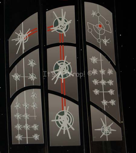 Description: A set of three Xindi-Arboreal panels featured in the Star Trek: Enterprise episode “The Shipment”. Appearing next to “Captain Arc her” (Scott Bakula) as he investigated the mining complex operated by “Gralic Dur” (John Cothran Jr.), the panels are large pieces of clear acrylic with expertly detailed Xindi iconographic applications and red silk-screening. The items are three panels that create a screen when placed next to one another, the emblem of the mining consortium is silk-screened at the top and the graphical applications are all presented lower and in sequence with one another as they fit. The items measure approx. 11.5 X 88.75 X 0.5 inches with the middle panel slightly shorter.