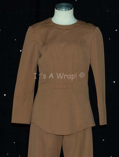 Description: A brown colored Starfleet Class-A uniform like those appearing in Star Trek I: The Motion Picture. The costume is brown trousers with a matching brown uniform top. The item comes with an unattached plastic bio-monitor and a white backed Epsilon IX assignment patch for the left breast that indicates the wearer to be a member of the command division. The costume is intended for female wearers.