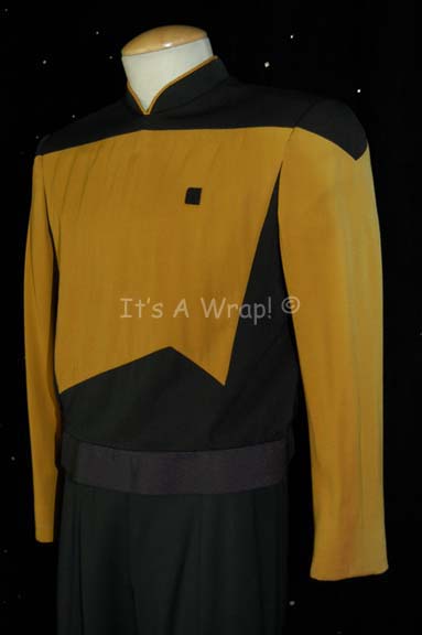 Description: A Starfleet uniform like those appearing in episodes of Star Trek: The Next Generation. The costume is a set of black trousers and an operations gold uniform top that zips up the spine with a mandarin style collar. The trousers feature a sewn in Star Trek VII tag and the uniform top features a sewn in tag reading ‘Dana V.’, a costumer’s tag also reads ‘Dana V.’. The outside left sleeve depicts a visible degree of fading due to time and storage conditions.
