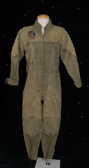 Description: A costume appearing in both the Star Trek: Enterprise episodes “Terra Prime” and “Demons” and in Star Trek X: Nemesis. The costume is a durable canvass jumpsuit with multiple lines of threading for detail, a zippered front, a series of laces at the sleeve and leg cuffs, and a vented back. The jumpsuit is adorned by an ‘Orpheus Mining Colony’ patch. The costume also comes with a set of strap on armor like those used by the Kolarans in Nemesis. The armor features stitched in metal, plastic, and rubber components.