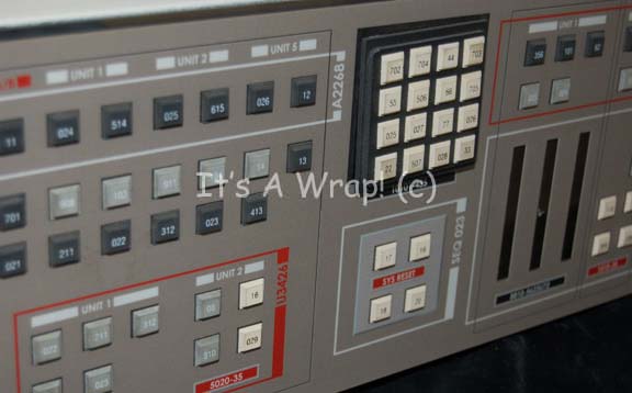 Description: A piece of set dressing featured in various episodes of Star Trek: Enterprise. This item was one of two consoles mounted on wheels for use in sickbay, it consists of a wood base with a piece of smoked acrylic adhered to the front with a graphical application adhered to the front of it featuring numerous, multi-colored, rubber faux buttons with numerical values arranged into numerous sets and rows; a non-functional black number pad with white numbers in the middle, and three vertical spaces on the right side that appear to be for data modules but aren’t open for them to be inserted. On the back is a ball joint fixed to an elbow and a white metal handle on top. The item measures approx. 18 X 9 X 11 inches.