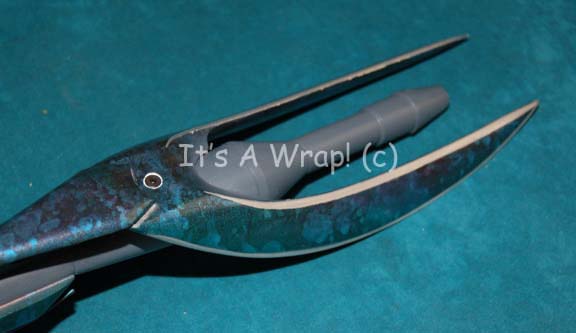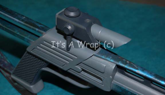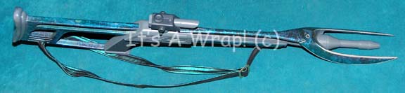 Description: A prop energy weapon featured in Star Trek X: Nemesis for use by Reman soldiers. The item is a Reman rifle, a cast resin rifle with a metallic purple paint job, a vinyl shoulder strap, a metal double bayonet beveled and painted to appear sharp, with a trigger button that activates a triple LED emitter tip, and a switch which activates a top mounted red ‘targeting scope'. The switch for the scope has loosened from its position but still works. The item is powered by an unknown power source and still retains energy from production use. The item measures approx. 35.5 X 7.25 X 1.75 inches and depicts repair where the bayonet has been adhered and the resin has been adhered.