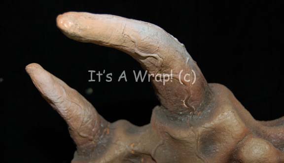 Description: A prop item featured in the Star Trek: The Next Generation episode “Darmok”; wherein “Captain Picard” (Patrick Stewart) is transported to the surface of a neutral world with “Captain Dathon” (Paul Winfield) of a Tamarian ship where they are forced to battle an electromagnetic alien creature. This fully painted mold has been attached to a base and pedestal for structural posture. The mask is cast of latex foam with inset ‘horns’ and ‘tusks’, a mouth that opens to some degree and is painted to appear as such. The piece shows some signs of deterioration due to time and storage but is still largely intact and should remain so in a proper environment. The item measures approx. 23 X 23 X 19 inches.