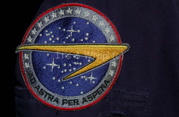 Description: A Starfleet uniform jumpsuit with engineering red division stripes around the shoulders featured in the finale Star Trek: Enterprise episode “These Are the Voyages…”. The costume features multiple zippered pockets and Velcro adjustments, sewn on shoulder epaulettes, a sewn on Starfleet Command patch on the right sleeve shoulder and no assignment patch on the left sleeve shoulder (item depicts evidence of removal). The costume is fit for a female wearer and comes with a black sleeveless button front uniform undershirt.