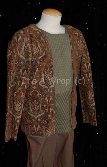 Description: A stunt costume featured in the Star Trek: Voyager episode “Darkling” for wear by Tom Morga performing stunts as “Zahir”. The costume is brown pseudo-corduroy trousers, and a quilted green shirt with an affixed patterned jacket. Both garments are labeled with Voyager tags reading ‘Tom Morga’ and the costumer’s tag reads ‘161 Darkling, Stunt Zahir, Tom Morga’.