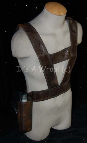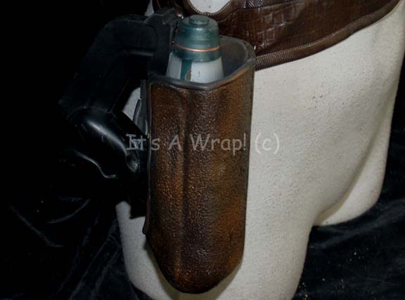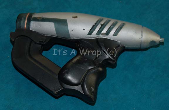Description: A prop energy pistol and weapon holster with belt created for non-Cabal related Suliban characters appearing the Star Trek: Enterprise pilot “Broken Bow”. The item is a brown colored vinyl belt with a vacuum formed plastic holster that features an international military clip on the reverse. The interior is lined with soft black adhesive foam. The belt features snaps for seals and measures approx. 38 inches. The energy pistol is soft molded foam rubber painted black, metallic silver, and features other painted graphics and measures approx. 9.5 X 6 X 2 inches. The prop pistol represents the last known available item in this configuration.