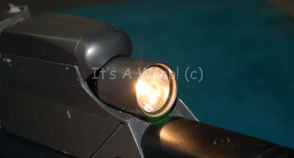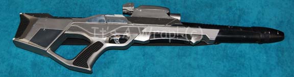 Description: A damaged, yet working hero version Starfleet Type III Mark III phaser rifle featured in Star Trek X: Nemesis. The item is a solid cast resin prop weapon with multiple working internal electronic features and metal accents. The prop is similar to previous Nemesis style phasers excepting that instead of metallic silver chrome adhesive accents the item is adorned with fashioned sheets of metal accents, some of which have lost their adhesive characteristics, but are accompanying. Multiple working battery powered electronic features are present and they are listed as a working Surfire name brand flashlight mounted into a fixed housing at the top of the stock that activates at the push of a button on the bottom of the stock, a working power readout on the stock that activates via a button switch (a line of green LEDs lights brightly across the gage from left to right, and a second red line of LEDs follows immediately thereafter), and a working trigger activates a four diodes at the barrel end and four on either side of the emission tip to create a ‘firing’ effect. The power readout gage functions on a CR 2 S sized 3volt battery, the other internal elements work on unknown batteries which still retain power from production use. Another electronic feature is the ‘power cell’ which is revealed by sliding back a metal cover plate immediately in front of the gage that is composed of a fashioned resin ‘power pack’ with translucent acrylic ‘batteries’ affixed to the top. This item is powered by a 25A sized 9volt battery (included with auction win, but kept out of housing to maintain power) that is housed internally and lights the item red, the lights do not deactivate except by way of a pressure switch that, when resting in its cavity within the weapon, should be stilled by sliding the cover over it. The weapon is also outfitted with a black nylon shoulder strap that retracts into the butt of the item. The item is painted metallic pewter with black accents, some scuffs are visible on the butt of the item and some etched scratching is apparent in the trigger guard front and on the butt end shoulder strap housing. The only major damage to the item is the scope characteristic of this version in the film is broken away from the rear of the flashlight mounting though the base mount of the feature remains and a non-functional switch as well as a yellow and a green wire is still present. The battery casing across the top of the emission end has not been opened and in fact the screws are painted into a fixed position. The item measures approx. 33 X 2 X 9.25 inches.