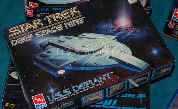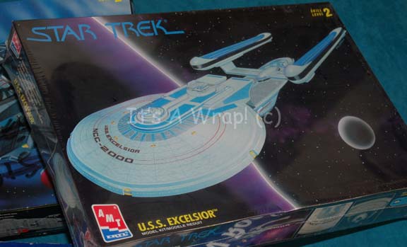 Description: A large lot of opened name brand plastic model boxes and their components acquired for use by the Star Trek art department. The lots are composed of boxes listing the items as “USS Excelsior”, “USS Defiant”, “USS Voyager”, “USS Danube”, an “Apollo” series “Saturn V Rocket”, and an “M2A2 Infantry Fighting Vehicle”. The models are not guaranteed to have all their corresponding pieces, some of the pieces have been punched out and painted, several of the boxes have been labeled or written on by Star Trek production personnel, much of the material in the boxes have been moved from one box to another. All of these boxes were located in the same, larger box. An unopened “USS Excelsior” model kit by ‘AMT Ertel’ is included in the lot.