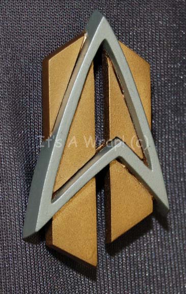 Description: A full–length gray Starfleet uniform jumpsuit made in the style of “All Good Things…”, the final episode of Star Trek: The Next Generation, to exhibit the future styling of Starfleet uniforms. This costume was featured in the final episode of Star Trek: Voyager, “Endgame”. It features black elastic stirrups at the feet, zips up the spine and clasps at the neck, a line of black piping around the shoulders, a double breasted appearance in the front and a Velcro patch on the left breast for a future-style commbadge (included but not attached), and a flesh colored, undergarment sewn into the garment. A sewn in ‘MUTO Little, Los Angeles’ tag and another tag that reads ‘Dino Maye’ are present.