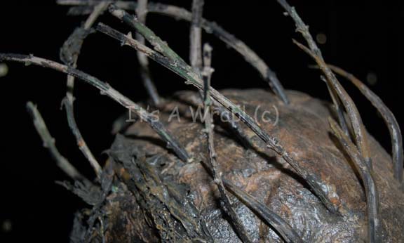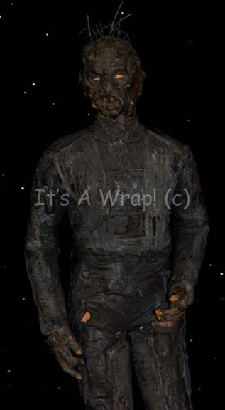 Description: A prop charred alien corpse mannequin created for the Star Trek: Enterprise episode “The Expanse” where it appeared as the Xindi-Reptilian super weapon probe pilot stored cryogenically. The item is sturdy molded foam rubber built around an internal framework. The mannequin is wearing a ‘charred’ version of an “Albino Guard” costume appearing in the Star Trek: Deep Space Nine episode “Bloodoath” which is blackened on the front and sleeves but not on the reverse. The face of the mannequin is horrifying with a mouth frozen in a toothy snarl, inset eyes that are unpainted internally leaving a pair of empty cavities that catch the light in dim rooms. The head also features several tines jutting away that are blackened like the rest of the item, but the charred effect is not in fact burn related thus it does not rub off onto external material. The item measures approx. 74 X 24 X 15 inches. This one of a kind prop alien represents the Xindi at a time prior to finalizing their appearance for the third season of Star Trek: Enterprise.