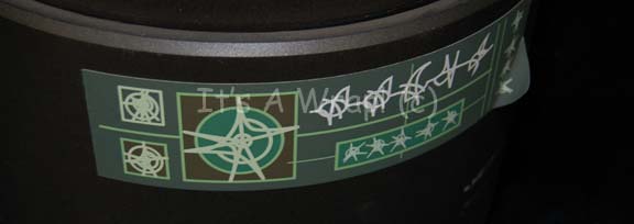 Description: A piece of set dressing similar to those featured in the Star Trek: Enterprise episode “Zero Hour” and believed to be the one featured in the episode “Minefield”. This item was featured as part of the interior mechanism of the Romulan mine that attached itself to the hull of the “Enterprise NX-01”; it has a resin cast silver-colored cylinder roughly the shape of an extremely oversized lantern featuring a graphical application on the side with Xindi script on it, an open area in the middle with several silver-colored plastic rods holding what would be the “lid” if the lantern metaphor is extended; six plastic, rod-shaped “lights” with graphical application accents around a similarly decorated metal core, a silver-colored plastic top featuring textured accents and plastic “windows” along the circumference and a group of six plastic “cog” looking aspects attached to the top of the top of the rod-shaped lights, all of which can be lifted out of the item housing like seen in “Minefield” . There are wires extending out from the bottom and the device lights up in screen caps but the electronics are untested. The item has an approx. diameter of 12 inches and a height of approx. 21 inches.
