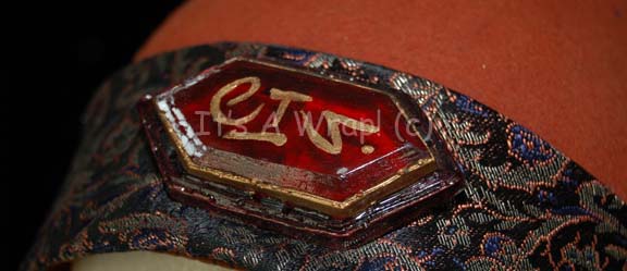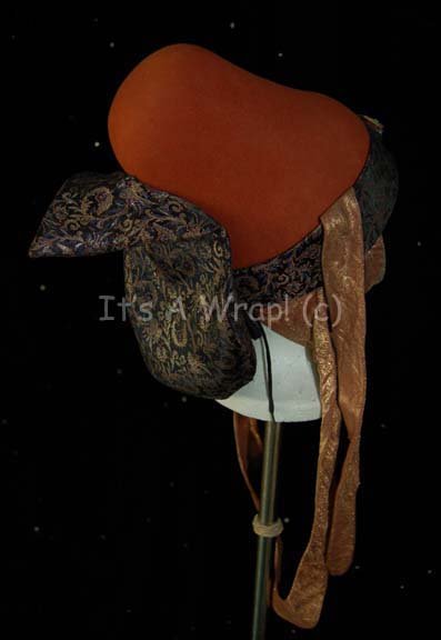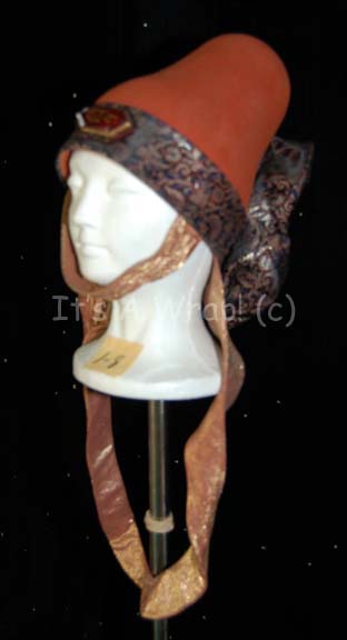 Description: A costume element of the style featured in “Search for Spock” and “The Voyage Home”. A rust-colored felt , Vulcan-style hat featuring black trim with a yellow, orange, and deep violet floral pattern, further accent on the back, gold and copper iridescent chin strap and scarf draping across the neck; a hexagonal, faux jewel featuring Vulcan iconography. A sewn in Paramount tag reads ‘1-8’.