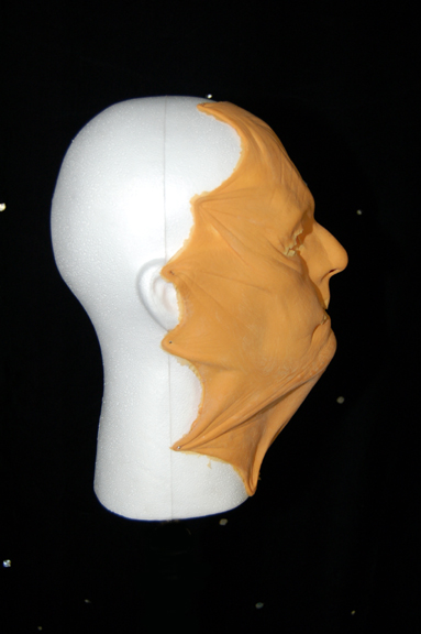 Description: An unused, unpainted special effects make-up mask like those appearing variously in Star Trek IX: Insurrection. The item depicts a face with stretched, pulled back skin, with two open eye holes, a mouth slit, and multiple wrinkles. The item is in excellent condition with supple life-like texture, defined edges, and no discoloration.