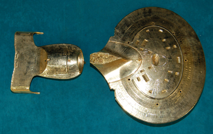 Description: A prop model of the “U.S.S. Enterprise-D” made with the intention to appear smashed by “Captain Picard” (Patrick Stewart) in a moment of rage during Star Trek VIII: First Contact. The item is a plastic molded model with a metallic gold finish applied across its entire exterior surface with a bracket for mounting to a wall. The item has been broken into the saucer section and the secondary hull. The saucer section is broken away with the secondary hull neck and the break point is painted metallic gold to generate the appearance of a broken model sitting in pieces. Five holes have been drilled into the saucer section around the phaser banks. No further components of this model are expected to be located. The items measure approx. 8 X 7 X 1.5 inches and 2 X 12.5 X 13 inches.