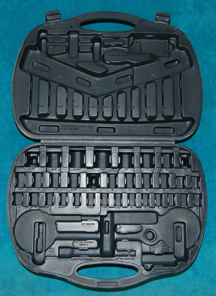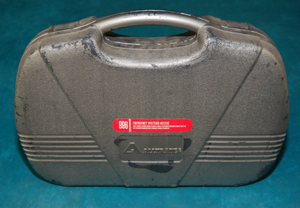 Description: A prop Starfleet carry case like those appearing variously in Star Trek episodic television. The item is a sturdy injection molded plastic case with a hinged lid that features flip latches and a molded carry handle. The interior is made to fit dozens of ratchet heads. Externally, the item is painted metallic silver with two Starfleet inventory applications adorning the sides. One reads ‘Emergency Systems Access’ and is red colored, the other ‘Environmental Systems’ and is brown. The item measures approx. 11 X 15 X 2.75 inches.