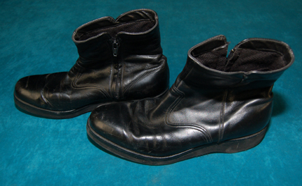 Description: A pair of black leather men’s boots appearing variously in Star Trek episodic television and/or feature films and are compatible with generally any Starfleet uniform. The boots are used Vibram name brand, have no actor’s name, but are in very good condition showing very minor wear on the heels.