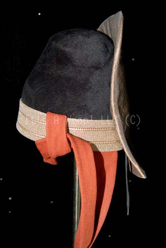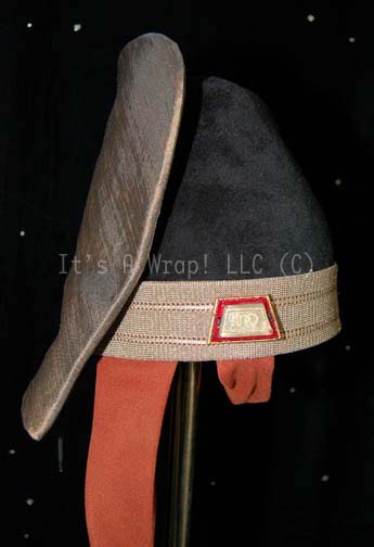 Description: A costume element of the style featured in “Search for Spock” and “The Voyage Home” as well as variously in Star Trek episodic television. A black, felt, Vulcan-style hat featuring wide, metallic-gold trim, bronze-colored chinstrap, iridescent brown accent on the back, and a trapezoidal faux jewel on the side of the hat with Vulcan iconographic symbols. The felt of the hat is still very soft and in almost excellent condition. A sewn in Paramount tag reads ‘1-7’.
