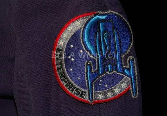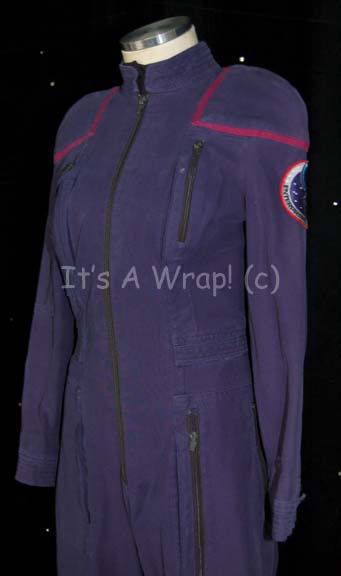 Description: A costume featured in various episodes of Star Trek: Enterprise. This Starfleet uniform jumpsuit includes the famous ‘Enterprise NX-01’ left shoulder patch with Operations red division strips around the shoulders. “Enterprise” costumes feature multiple zippered pockets, Velcro size adjustments and zippers at the wrists and ankles, come with detachable shoulder pads, and a black, button up, sleeveless undershirt. A sewn in Enterprise tag in both items reads ‘Summer Sabry’ with one tag also having the name ‘Dawn Drake’ and a costumer’s tag renaming Sabry.