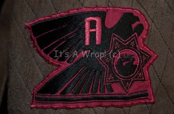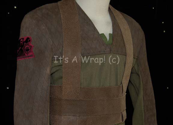 Description: A costume featured in the Star Trek: Voyager episode “Flesh and Blood”; wherein “Voyager” answers a distress call from a Hirogen base that has been utterly decimated by the holograms from the holodeck technology that “Captain Janeway” (Kate Mulgrew) gave them. This costume is a long-sleeved, full-length, gray-green jumpsuit featuring brown suede along the shoulders and on top of the sleeves, a red military patch on the right shoulder, a short sleeved, olive-green tunic undershirt, and a brown, leather harness and belt. The patch on the shoulder was seen on the “Sanctuary District” uniforms in the DS9 “Past Tense” story arc and on Mari uniforms in “Random Thoughts”. A sewn in Voyager tag in both garments reads ‘Johnny Linares ' and the costumer’s tag reads ‘254 Flesh and Blood, Nuu’bari Miner, Johnny Linares’.