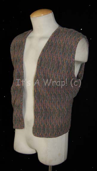 Description: A costume element like those featured in various episodes of Star Trek: Voyager for wear by Garrett Wang as “Ensign Harry Kim”. This item is a gray vest featuring a multi-colored stripe pattern and a raised hexagonal design down the front. A sewn in Voyager tag denotes wear for ‘Garrett Wang’.