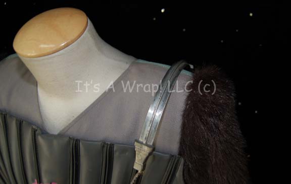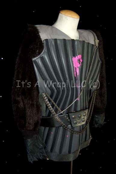 Description: A of costume elements featured in the sixth Star Trek feature film “The Undiscovered Country”. This lot consists of a Klingon chest piece worn by one of the Klingon shot by the Federation conspirators on board “Kronos 1” just before the assassination “Chancellor Gorkon” (David Warner); it is dark-gray, quilted vinyl with black, raised stripes down the front, chain accents, pyramidal, textured, rubber strips on the sides, gray, quilted material on the underside, and featuring a phaser ‘burn hole’ in the chest along with pink, special effects, Klingon blood. A gray, long-sleeved, tunic featuring black, faux fur sleeves, matching dark-gray vinyl to the chest piece on the back with more special effects blood on the front and back, multiple Velcro placements, and a label that reads merely ‘Leva’; a black vinyl belt featuring a resin buckle painted metallic silver with five ‘studs' that have the remains of metallic gold paint on them and a pair of wire loops molded into the reverse to feed the belt through. The belt has a Velcro placement on the back and a label that reads ‘Robert Bruce’. Included are a pair of black leather gloves with the fingers cut out and little ‘claws’ attached, and a silver-colored, metal aglet with a length of chain attached for aesthetic purposes.