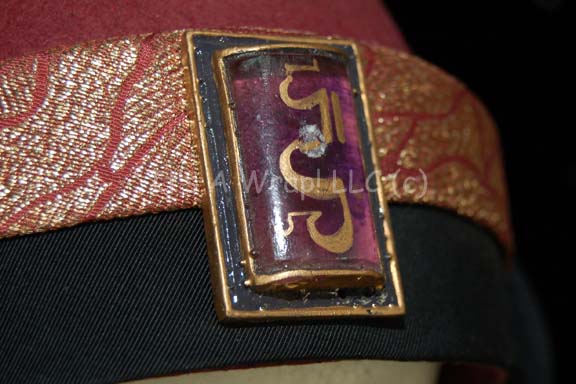 Description: A costume of the style featured in various Star Trek feature films. This costume consists of a long-sleeved, tan-colored robe featuring large, bell-sleeves, metallic-gold dickie sewn on, and matching trousers. A sleeveless, peach-colored tabard featuring a reflective-gold, floral pattern, black trim, a multi-colored stripe down the right side of the abdomen and a red, faux jewel with Vulcan iconographic symbol. Included is a maroon, Vulcan-style hat featuring black trim that becomes a chin strap, similar reflective gold on maroon trim, and matching accent in the back with the color scheme reversed; a purple, rectangular, faux jewel with Vulcan iconography like the costume. The hat exhibits minor fading due to time and storage. The robe has a sewn in Paramount tag that reads ‘4-1’, the tabard ‘2-5’, and the hat ‘2-10’. This costume is one of but a few left of those thus located.