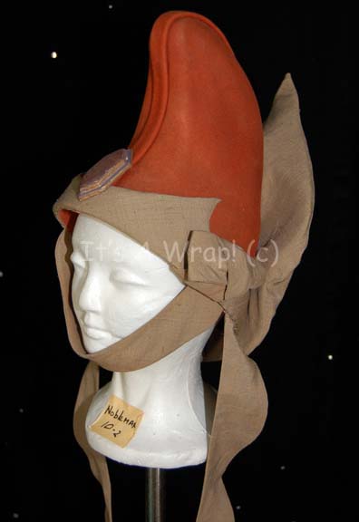 Description: A hat made in the style of those from the earlier Star Trek feature films. This item is a rust-colored, steeple-shaped, Vulcan-style hat featuring tan trim that becomes a chinstrap, has pointed accents along the front, a strap that hangs on the chest, and another large, teardrop-shaped one on the back. Included is a hexagonal faux jewel with Vulcan iconographic symbols set higher on the hat than most. A sewn in Paramount tag reads ‘Nobleman, 10-2’.