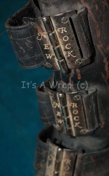 Description: A pair of boots like those featured in the eighth Star Trek: feature film “First Contact”. These boots are of the famed “New Rock” brand, very sturdy, mid-calf, black leather boots featuring large metal clasps with the brand name carved into them with which wide, Velcro flaps fit into securing the boots; metal accents on the front and back are screwed on and can be removed to replace with various accessories or further accents. Two inch, black rubber soles have gravel and debris stuck in the tread from screen use, “New Rock” is engraved in the sole as is the company logo carved into the leather on the lip of the boot. The items are intentionally distressed to appear ‘used’, appear to be men’s size 10, and feature a label inside the left one that reads ‘Jeff Boba’.