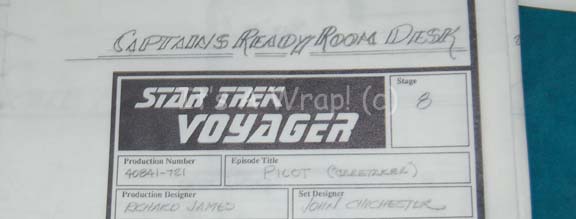 Description: A lot of schematics for sets featured in the pilot of Star Trek: Voyager and episodes afterwards. These schematics include desk and room layout details and are labeled either “Captains Ready Room” or “Int. Ready room”. These items feature information like the show name, stage, and production number, original date, set name, production and set designer on a panel in the lower right hand corner.