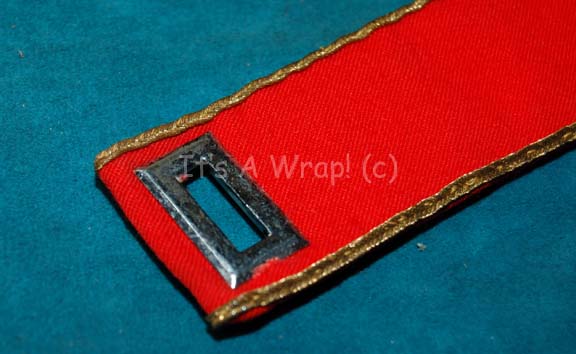Description: A Starfleet officer’s division strip like those appearing in Star Trek feature films. The item is a red fabric length with gold trim, remaining threads from accent removal, and a metal reinforcement. The item measures approx. 12.75 inches long