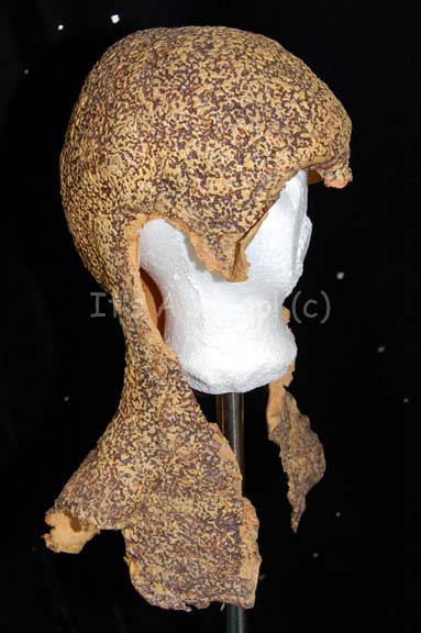 Description: A special effects make-up full head wrap intended to be an adult Suliban appearing variously in episodes of Star Trek: Enterprise. The item is molded foam rubber made to appear blotched and painted brown with a topcoat of tan. The item is in good condition overall with a supple feel generally, the edges of the item are in good condition with generally dry areas.