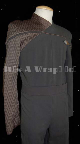 Description: A costume featured in the Star Trek: Voyager episode “Relativity”; wherein “Seven of Nine” (Jeri Ryan) is recruited, repeatedly, by “Captain Braxton” of the 29th century time ship “Relativity” to go back in time and prevent the destruction of “Voyager”. This costume is that of the first officer of the “Timeship Relativity”, “Lieutenant Ducane” (Jay Karnes), and is a 29th century Starfleet uniform consisting of a long-sleeved, full-length, dark-green jumpsuit featuring diamond-patterned quilting in a light green shade from the right collar, across the shoulder, and down the arm; piping along the chest in dark-green over the quilted section and light-green over the rest. A white, sewn on collar, matching belt, 29th century-style Starfleet commbadge attached to a Velcro placement on the left breast, and two, unattached similarly styled pips equaling the rank of “Lieutenant”. A sewn in Voyager tag reads ‘Jay Karnes’ as does the costumer’s tag as well as the episode name and number. This alternate color scheme in the uniform is the only such item located thus far.