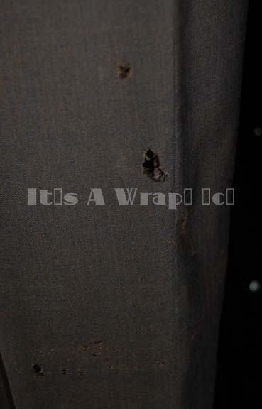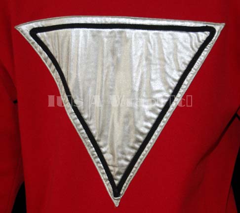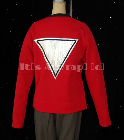 Description: A Starfleet uniform composed of several differing components from a variety of eras. One piece is an operations red Starfleet uniform shirt with long sleeves, a black collar, an invisible zip seam along the left shoulder line, with an inverted reflective silver triangle sewn onto the back. This top may have been altered for episodes of “Mork and Mindy” and is believed to have been created for episodes of Star Trek: Phase II due to the fabric. The trousers are a charcoal grey colored and are cropped to below the knees with pleats and flairs as cuffs. They exhibit subtle pockets in the front and rear and depict a degree of damage in the form of small holes around the top left thigh and knee, a zippered fly, and an accompanying, yet removed button at the waist. The boots are black leather with tan interior lining that zip up the inside and are labeled as being size ‘10C’, with sound dampening foam adhered to the heels and soles, they are believed to have been worn in the Star Trek: Deep Space Nine episode “Trials and Tribble-ations” and/or the Star Trek: Enterprise episodes “In a Mirror, Darkly: Parts I and II”. A costumer’s tag reading ’30,25” was located with the trousers and a costumer’s tag reading ‘Mork and Mindy’ was located with the uniform top.