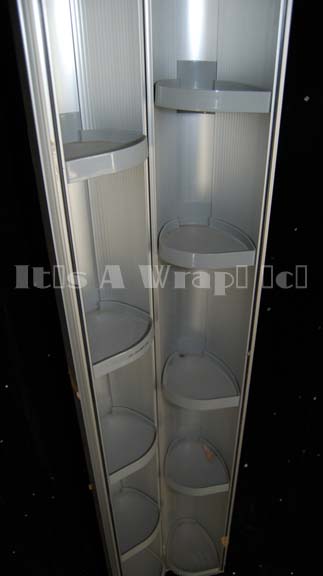 Description: A set dressing piece appearing in various episodes of Star Trek: Enterprise in crew quarters sets. The item is a wall mounted shelving unit made from a silver colored metal shell that opens clam fashion vertically from the center to reveal a system of shelves on two sides. The shelves are shaped to fit inside the enclosed environment and can change position by way of loosening a screw and moving it. The item features twelve position changing shelves that have raised lips on one side to keep items within and the lowest base of the item functions as a shelf. The back of the item features its wall mounts. The item measures approx. 66 X 11.5 X 7.25 inches open and 66 X 13 X 6.75 inches closed.