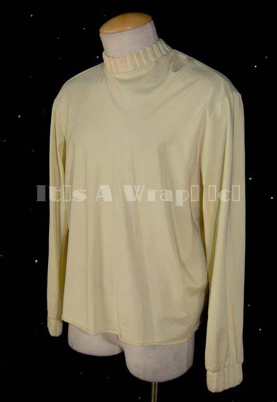 Description: A costume element like those featured in various Star Trek feature films from “The Wrath of Kahn” to the opening scenes of “Generations. This costume is a stunt version of the undershirt that James Doohan wears as “Captain Scott”; it is a long-sleeved, Starfleet undershirt in Command while with a ribbed collar and zip down the back. A sewn in Paramount tag reads ‘Doohan Stunt’ and a second tag reads merely ‘Doohan’.