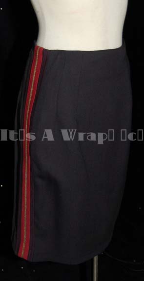 Description: A costume element like those featured in Star Trek VI: The Undiscovered Country and possibly in the opening sequences of “Generations”; a black skirt featuring wide, red stripe down the side and thin, gold piping down the middle of the stripe. The gold piping denotes flag admiral rank. A sewn in tag bears the initials ‘J.L.’.