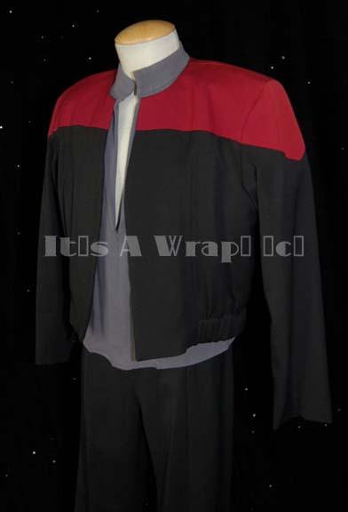 Description: A lot of costume items like those featured in Star Trek: Voyager and the seventh feature film “Generations”. This costume consists of a black, long-sleeved, Starfleet uniform jacket featuring the Command red across the shoulders and a Velcro placement for a commbadge (not included), black, uniform trousers, and a long-sleeved, blue/gray undershirt that zips up halfway. A sewn in Voyager tag in the undershirt reads ‘Robbie McNeill’ and the trousers have a sewn in Star Trek: VII tag that reads ‘Gerald Brodin’.