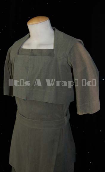 Description: A costume featured in the Star Trek: Voyager episode “Unity”; wherein "Commander Chakotay" (Robert Beltran) is rescued and cared for by a band of former Borg humanoids and try to impose their will on him through the telepathic link that helped him heal so quickly. This costume is for wear by Ivar Brogger as the Romulan former Borg “Orum” and consists of a half-sleeve, knee-length, dark-green jacket featuring a matching, mid-riff vest, belt, and overall-style trousers. The left arm has a moderate amount of fading due to time and storage. A sewn in Voyager tag in both items reads ‘Ivar Brogger’ and two costumer’s tags reiterate this.