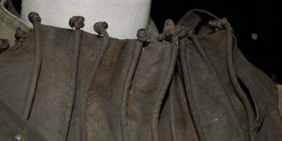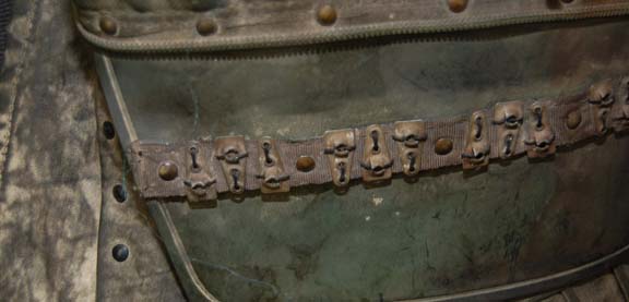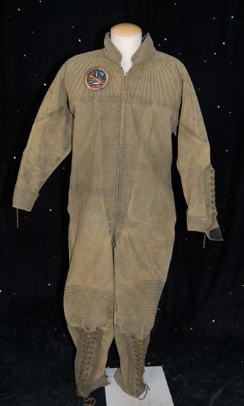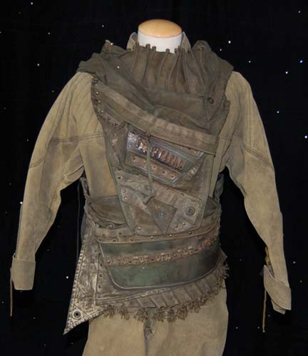 Description: A costume featured in the last Star Trek feature film, “Nemesis” and reused in the Enterprise episode “Demons” as jumpsuits for the ‘Orpheus Mining Colony’ on the moon. This costume consists of a long-sleeved, full-length jumpsuit in a distressed, aged, yellowed brown color featuring diagonal quilting along the shoulders, Velcro and laced wrist cuff adjustment, a zip down the front, reinforced quilting at the knees, zipped and laced ankle cuff adjustment. Also included is a piece of heavy-duty, leather body armor featuring metal and rubber accents on the front, various straps and snaps to secure it, and olive-green canvas shoes that tie at the bottom and zip up the ankles. For its use in Enterprise, this costume had the body armor removed, added a patch under the right shoulder that reads “Orpheus Mining Colony, Est. 2090, Sine Qua Non”, and a sewn in Enterprise that tag reads ‘Scott Booker #96’. This costume appears to be the last of the type hereby found available.