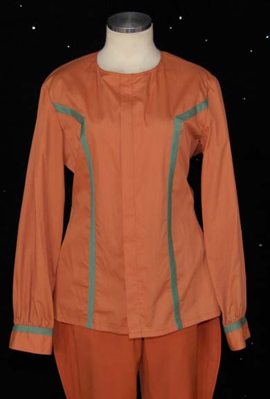 Description: A costume like those featured in the earlier Star Trek feature films. This costume consists of a light-brown, long-sleeved shirt with light green stripes down the front, back, and around the cuffs, a zip down the front, and overall-style trousers of a slightly darker shade. Sewn in Paramount tags are either blank or have faded.
