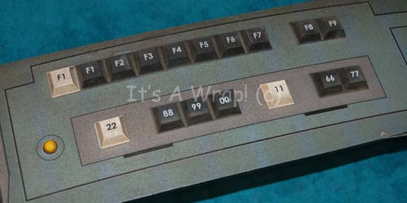 Description: A piece of set dressing featured in the Star Trek: Enterprise episode “Terra Prime”. This item was part of a computer console in the Orpheus Mining facility and consists of a rounded piece of smoked acrylic featuring graphic application adhered to the front with multi-colored, rubber, faux buttons themselves with alphanumeric values, and three small ‘windows’ that would have an indicator light shining through it. The item measures approx. 24 X 5 inches.