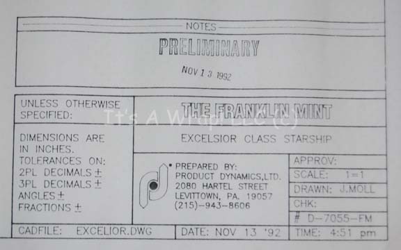 Description: A schematic for licensing information like those used for varying products released during the history of the Star Trek franchise. The item is a single white paper sheet with a multidirectional rendering of an “Excelsior Class” ship like the “USS Excelsior”. The ship is shown in six directional faces with a legend in the bottom right corner relating the work to ‘The Franklin Mint’ dated November 13, 1992 and prepared by ‘Product Dynamics, LTD.’.