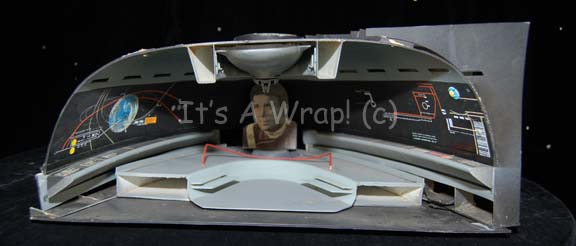 Description: A model of the proposed bridge of the “U.S.S. Excelsior” created for Star Trek III: The Search for Spock. The item is composed of fashioned sheet plastics and color paper graphical displays. The two piece model is separated into a fore and aft piece that opens out in the middle to allow the viewer to see inside where a two level deck is presented, a captain’s chair, a helm and con placement, several chairs mounted to the deck around the back facing the rear displays, and comes with three red and black painted plastic figurines, and a fourth with a fashioned gray long coat in a standing position. A pair of red railings section off the center, the display graphics depict a conceptual spacedock or station, a schematics, and one control surface is a depiction of the Midway “Pac-Man game” board. The fore section continues with large graphical displays and centers on a proposed “holographic” viewscreen depiction of “Admiral Kirk” (William Shatner) that is realized by a two dimensional photocopy of the character on a placard that can be hung from the overhead “display generator”. Items measure approx. 11.5 X 16 X 7 inches and 16 X 12 X 7 inches.