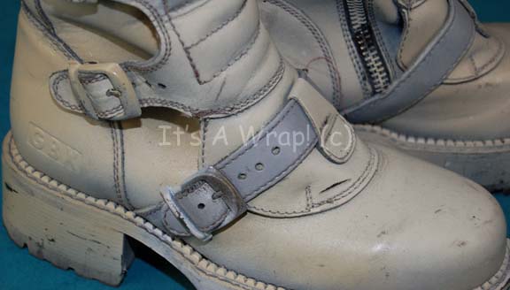 Description: A pair of boots featured in the Star Trek: Enterprise episode “The Aenar”; wherein “Captain Archer” (Scott Bakula) and “Commander Shran” (Jeffrey Combs) go to “Shran's” home world of Andoria to search for an elusive sub-race called the Aenar. These boots are “GBX” brand, painted an off white, with multiple buckles up one side and a zipper down the other side, and thick soles with ‘snow’ still stuck in the tread from production use. The paint is wearing off in places but is still mostly intact. A label in both boots denotes wear by regular extra Glen Hambly.