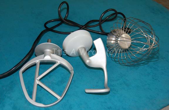 Description: A set dressing item featured in the final Star Trek: Enterprise episode “These are the Voyages…”, a fully functional electrical kitchen mixer manufactured by ‘Kenwood’. The item is a heavily based metal free standing machine with a polished aluminum mixing bowl that locks into place, a flip latch that pops the mixer housing up at a 45 degree angle, a six speed dial, and three differing interchangeable mixing attachments. The item is believed to be metallic silver painted die cast and has been altered to include Starfleet inventory applications and rubber faux buttons. The item base has rubber feet for a no scratch feature and the item measures approx. 16 X 13.75 X 10 inches. The item is powered by 120volt electricity by way of a type-A two blade plug. A label on the underside interior reads ‘Kenwood, Havant’.
