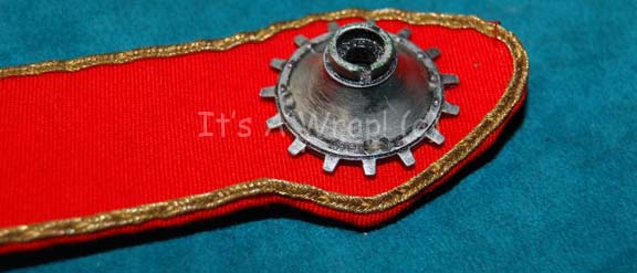 Description: A Starfleet officer’s division strip like those appearing in Star Trek feature films. The item is a red fabric length with gold trim, remaining threads from accent removal, a metallic silver painted ‘security disk’ stitched onto the blade end, and a metal reinforcement. The item measures approx. 12.75 inches long