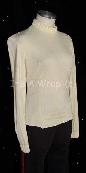Description: A lot of costume elements like those featured in Star Trek feature films from “The Wrath of Khan” to the opening scenes “Generations”. This lot consists of a long-sleeved, Starfleet uniform undershirt in Command white with a ribbed collar and zip down the back. Included are black uniform trousers featuring a wide, red stripe down the leg with two matching gold stripes down the middle of the red one denoting admiralty. The name ‘Overman’ is written in the undershirt, a tag on the trousers reads ‘30/26’. The trousers cuffs need to be hemmed but aren’t damaged and the hem around the top of the trousers is coming loose as well.
