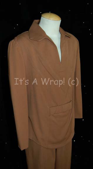Description: A brown colored Starfleet Class-A uniform with a collar featured in Star Trek I: The Motion Picture. This costume consists of brown trousers and a collared shirt featuring a sewn on Security silver-backed Starfleet emblem patch on the left breast with an attached bio-monitor; brown plastic with a black adhered label and metallic silver colored details to suggest technology. A sewn in Paramount tag in the shirt reads merely ‘44’ and is one of the very last complete Class-A uniforms thus located.